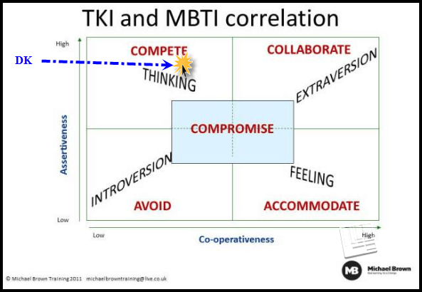 I’ve been watching the debates and the bad actors in government. I’ve concluded that I’m a master compromiser when compared to this crowd. Then the mirror swings around and hits me on the forehead. See the chart below. Here’s Michael Brown’s 4-box on Compromise. I have no idea what “TKI” and “MBTI” stand for. Check out his full post on the theory behind it – I’ll let you hash that out with Michael and his high brow intellectual friends. I just wanted (needed) to get to the bottom line – how do I score? (Yes, it is always about the score. Yes, it is.) See the arrow pointing to my position. (And no one was looking when I nudged the star over to the right with some elbow grease. Hey, at least I’m not in the bottom right, right?. Poets/Artists, save your breath. I’m immune to the beatings on my lack of sensitivity on this topic.)
